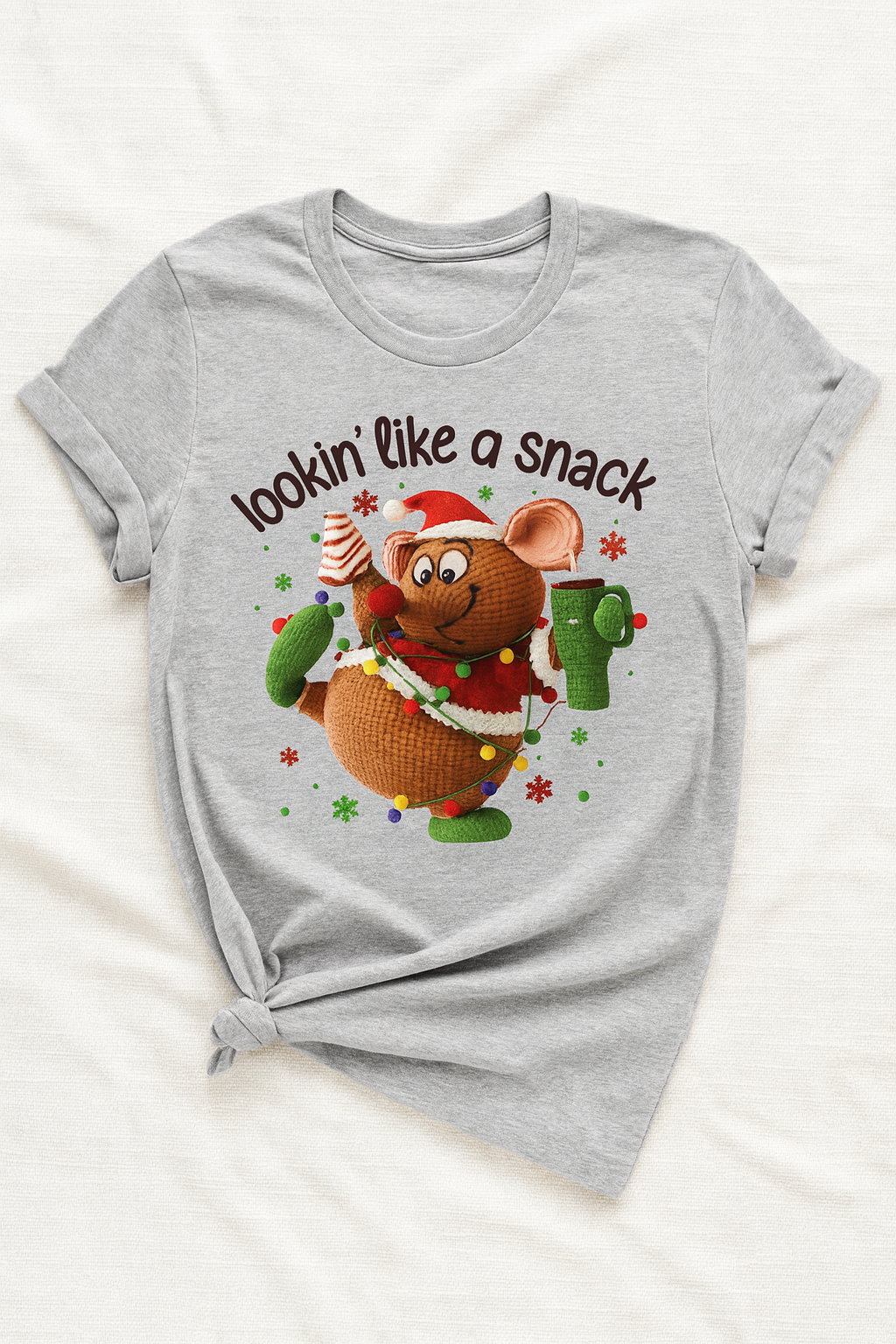 Cozy heather gray tee featuring a festive holiday mouse wrapped in lights with the phrase “lookin’ like a snack.” Boutique-style design with warm Christmas vibes—perfect for holiday outfits and gift giving.